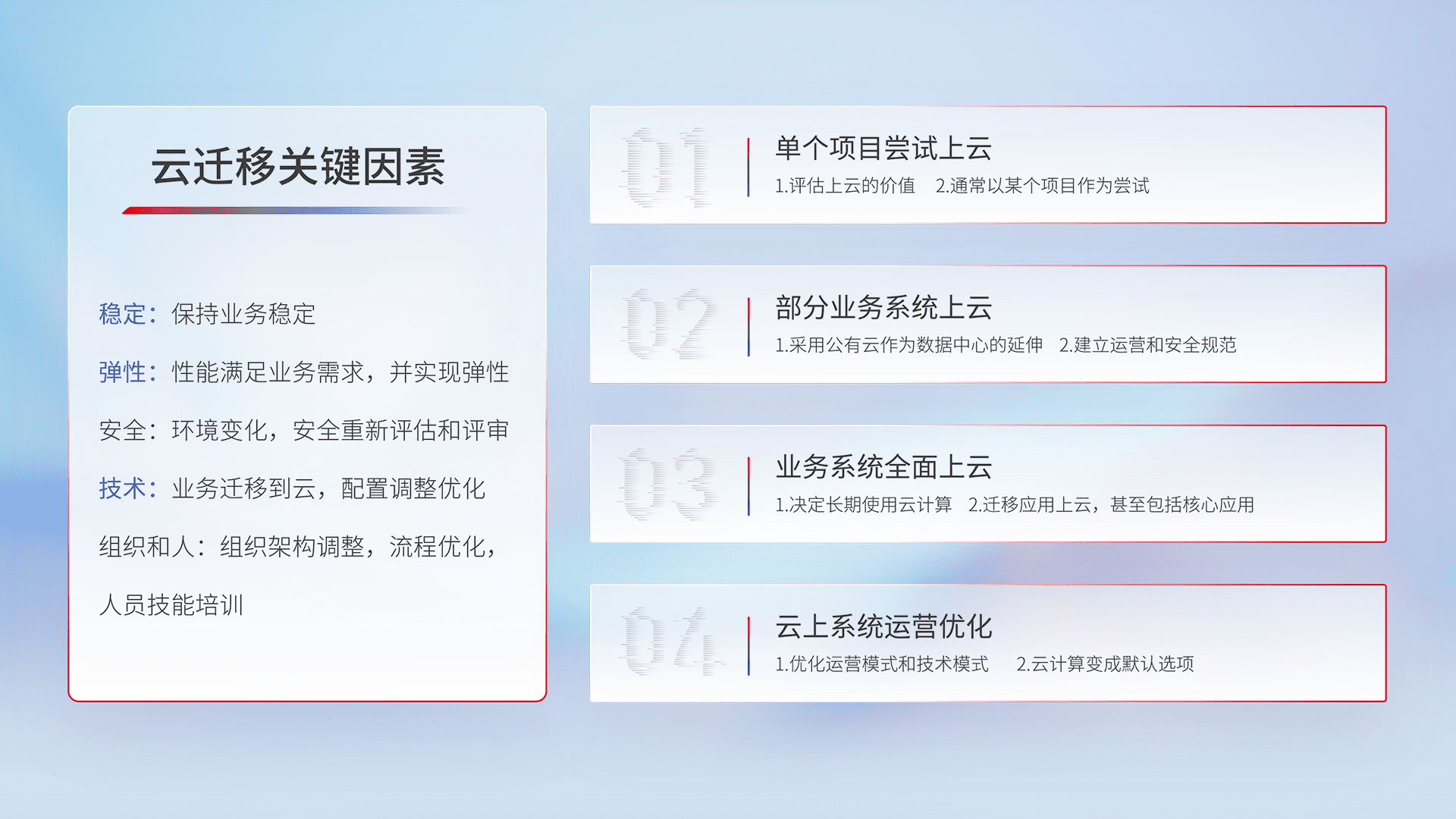 结合实际业务,,从规划设计、、、、云平台选型、、、、云原生改造、、、、数据迁移、、、、集成交付,,迁移全过程为客户识别最佳上云路径,,,,做好风险识别管理,,,,设计网络架构、、、身份权限、、、、安全审计合规、、、操作审计、、日志审计、、、监控告警策略、、、、多站点容灾设计等,,,对云上基础设施进行整体规划,,提升IT治理水平,,,,以满足弹性、、高可用、、高性能的需求。。